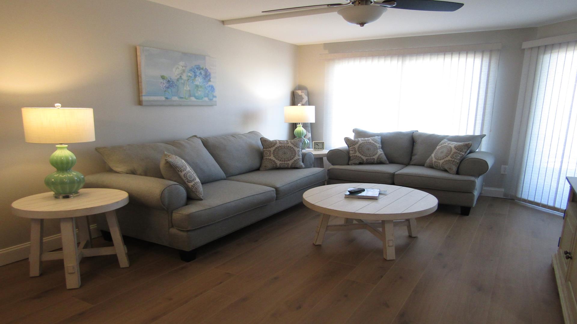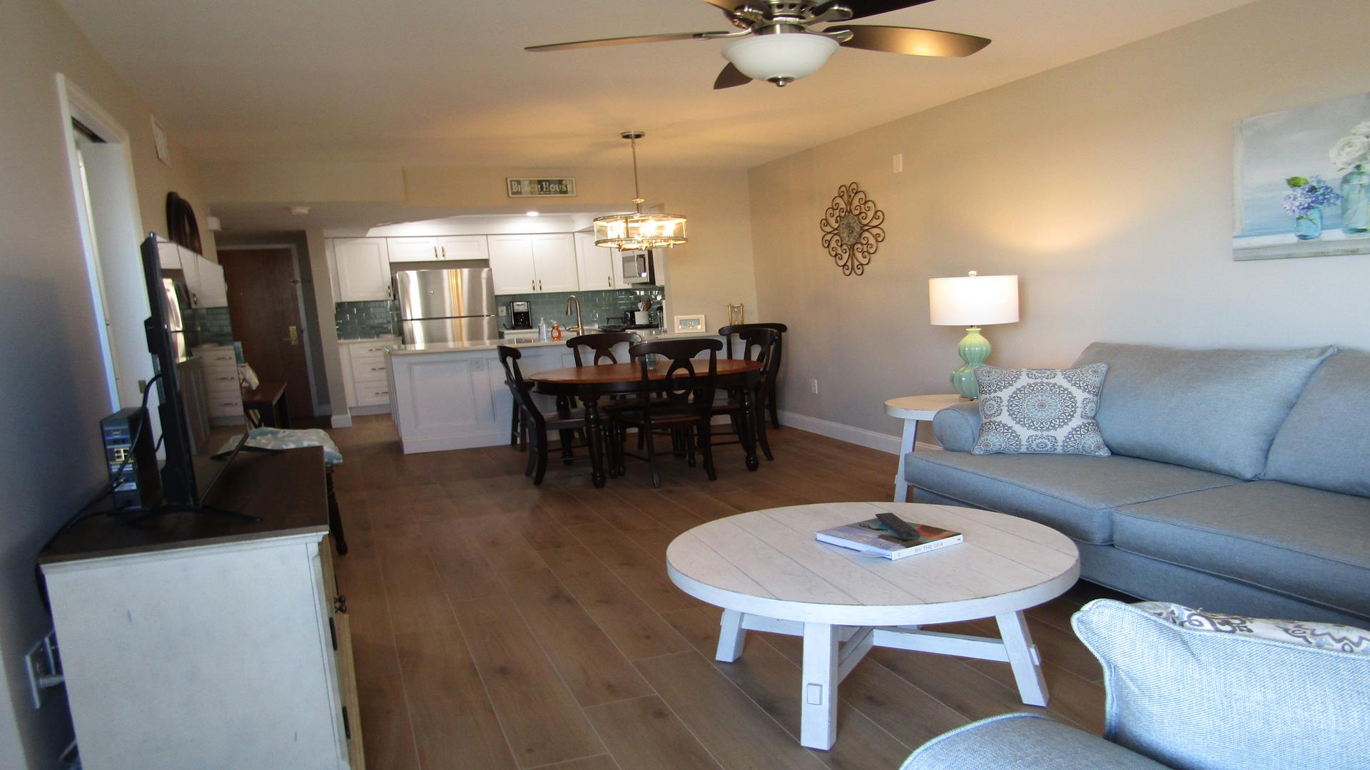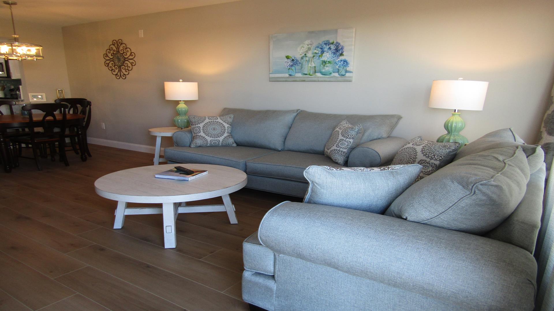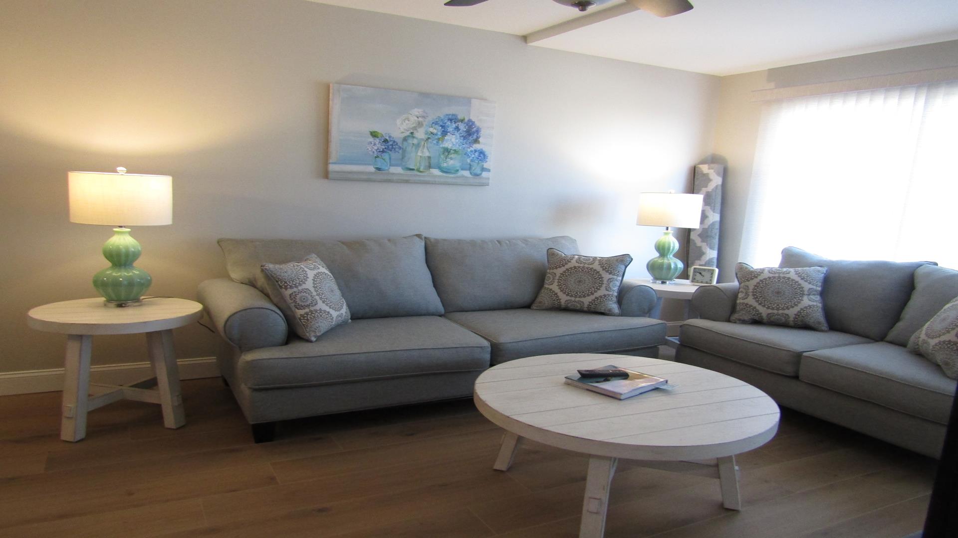 Beautifully renovated one-bedroom plus den, one-bath residence that has been completely refreshed from top to bottom. Features include new flooring, paint, furniture, and mattresses, along with an upgraded kitchen showcasing new countertops and appliances. The master bedroom and living room feature ceiling fans, and the bathroom has been fully updated with new tile, vanity, and a glass shower door with curtain. Additional highlights include an in-unit washer and dryer and new balcony furniture added in 2024. A stunning, move-in-ready coastal retreat.